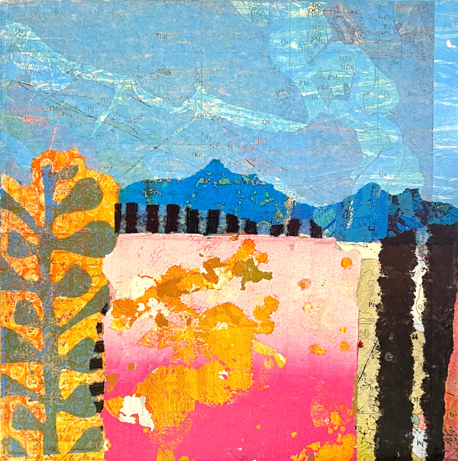 Abstract, mixed media collage of a Columbia Gorge landscape with vintage map, mono-type printed papers on a cradled panel. 8X8"