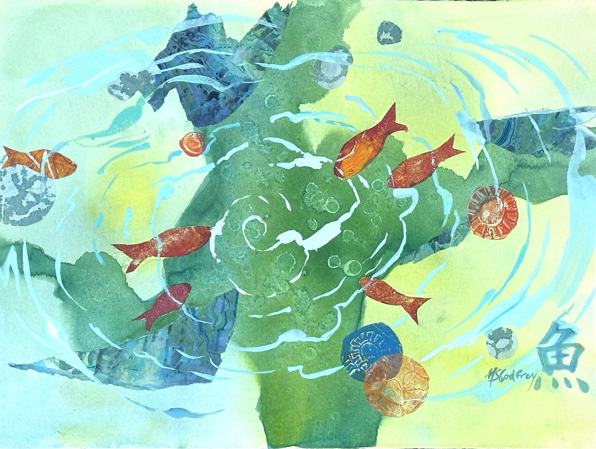 Delightful mixed media painting in abstract realism, framed with plexiglass.