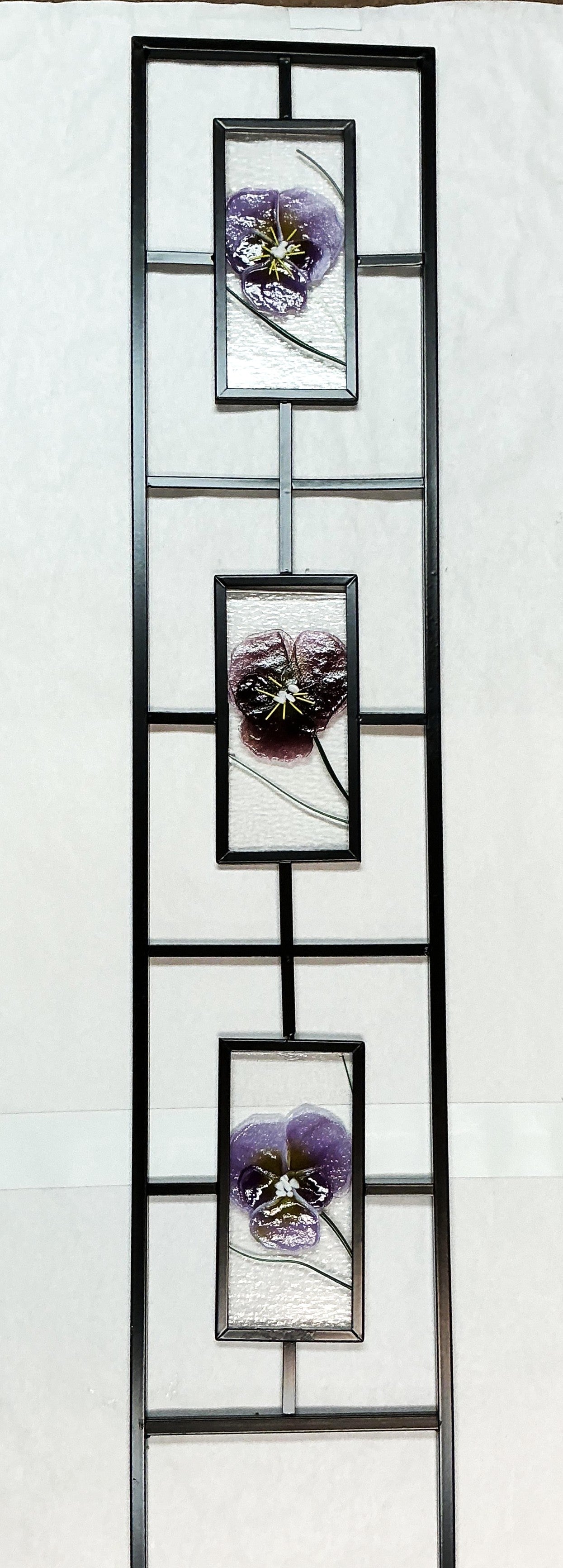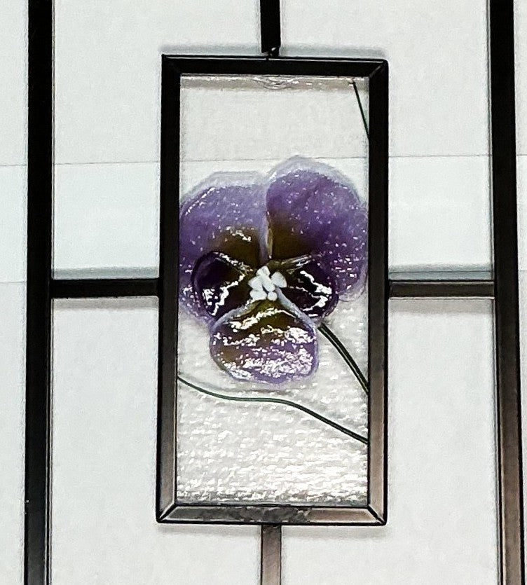 Stunning colorful fused glass garden stand with triple purple pansies. 45" tall, 8" wide.