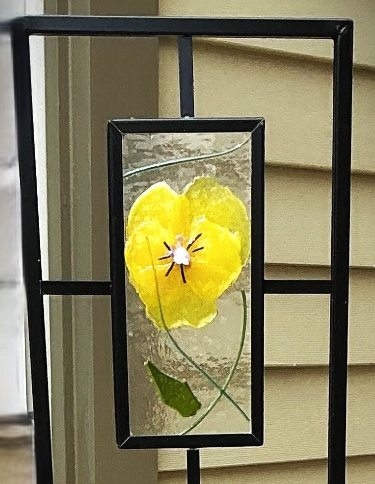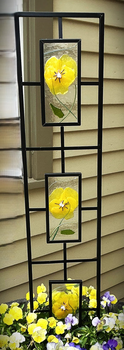 Sunny and colorful fused glass garden stand with triple yellow pansies. 45" tall, 8" wide.