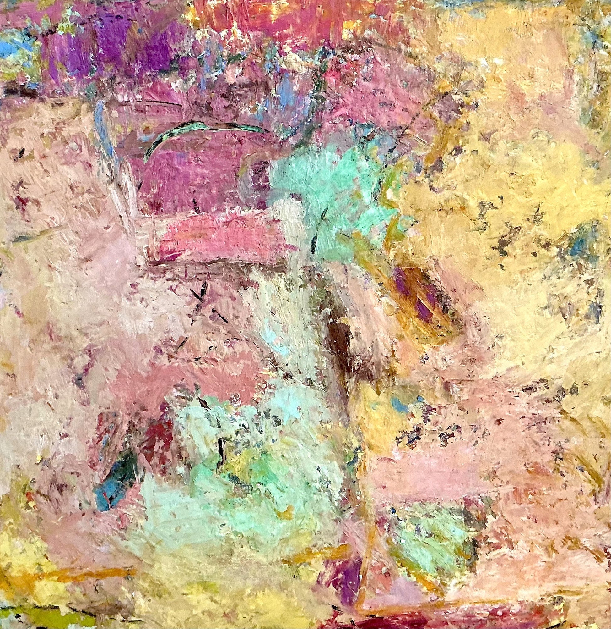 Oil cold wax medium abstract painted in warm, spring-like colors on a cradled panel.