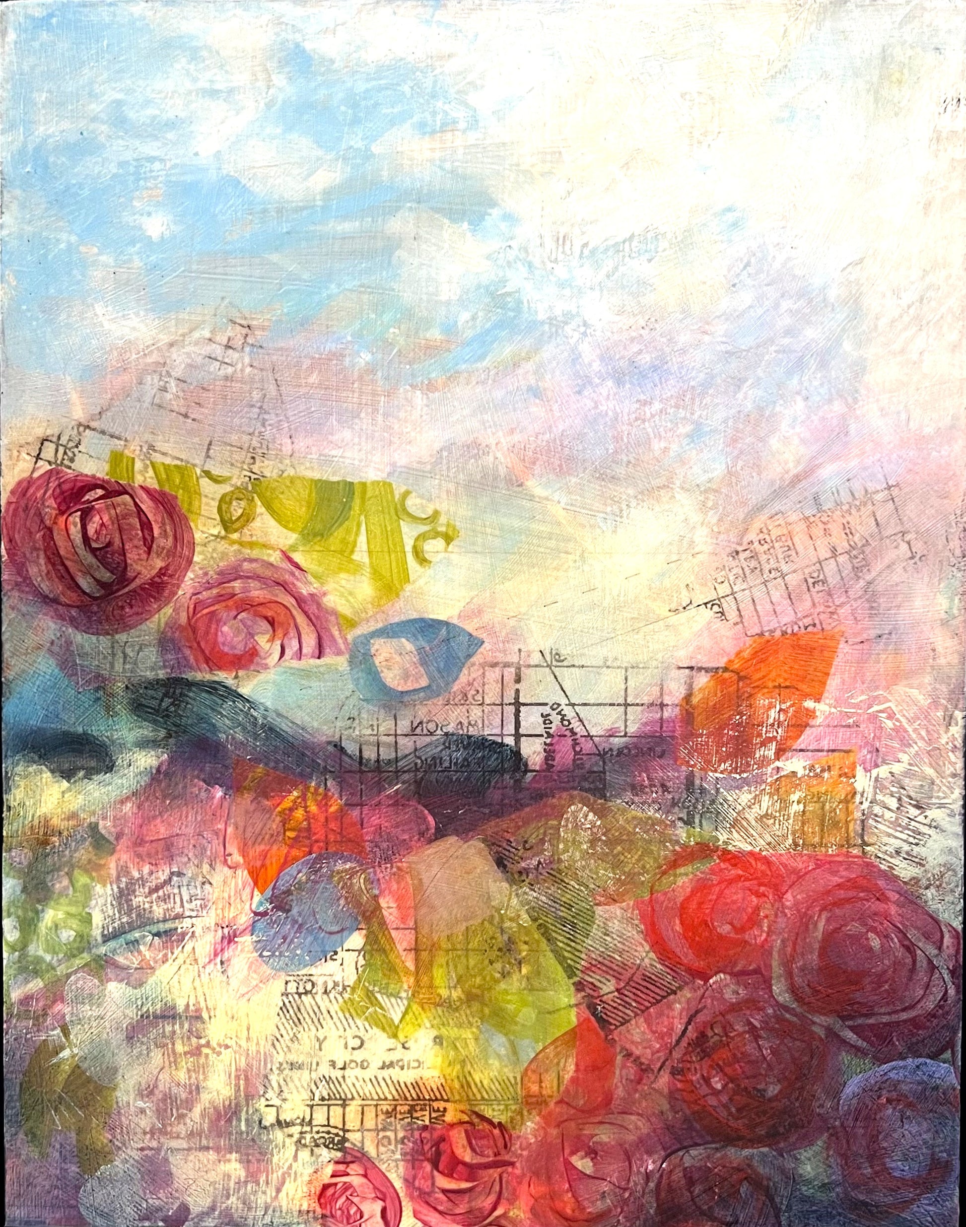 Abstract, acrylic mixed media landscape with vintage Oregon map. 11X14"