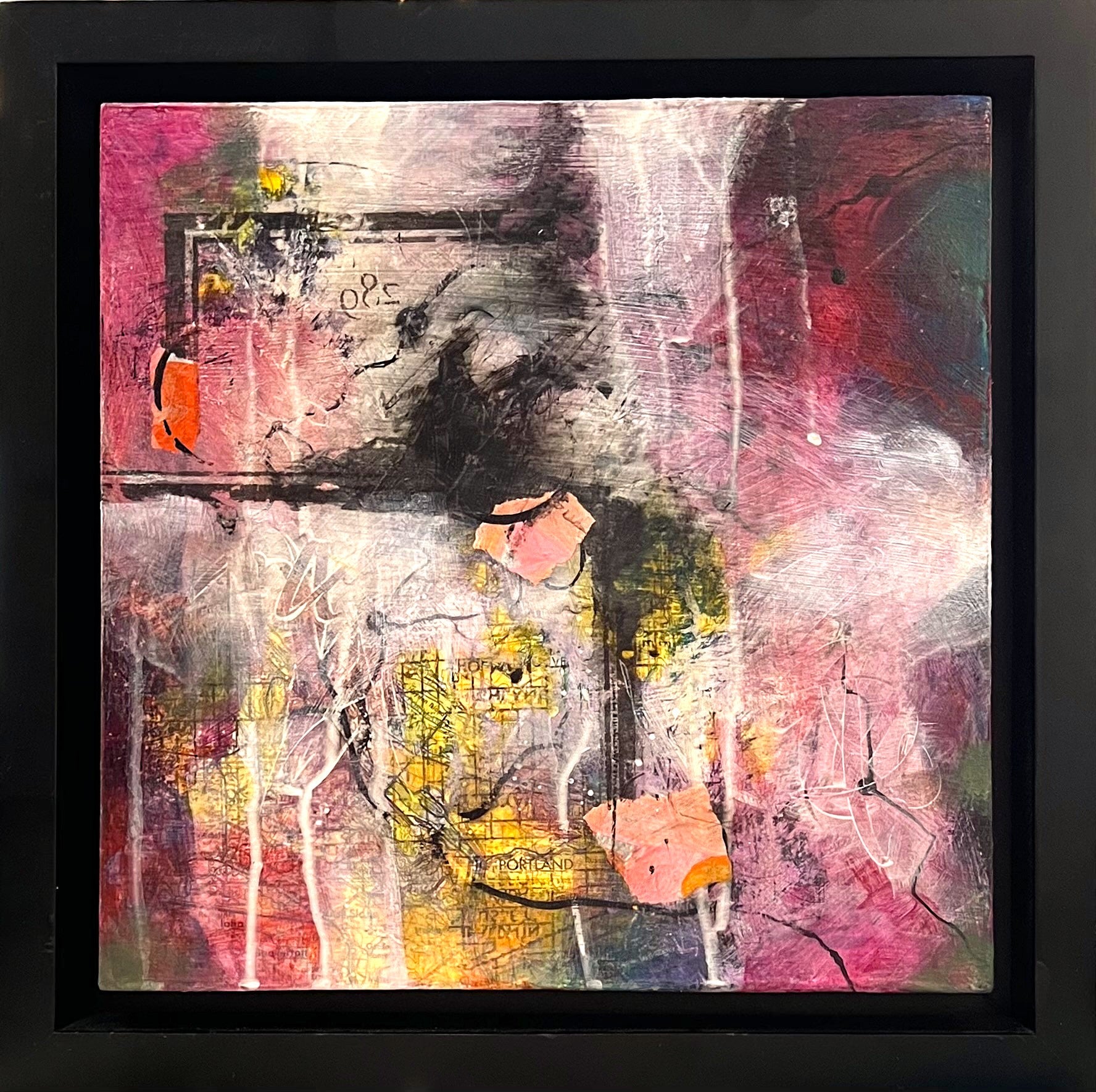 Abstract, acrylic mixed media collage with rose' tones on cradled panel with vintage Portland map. 12x12 unframed - approx. 15x15, framed.