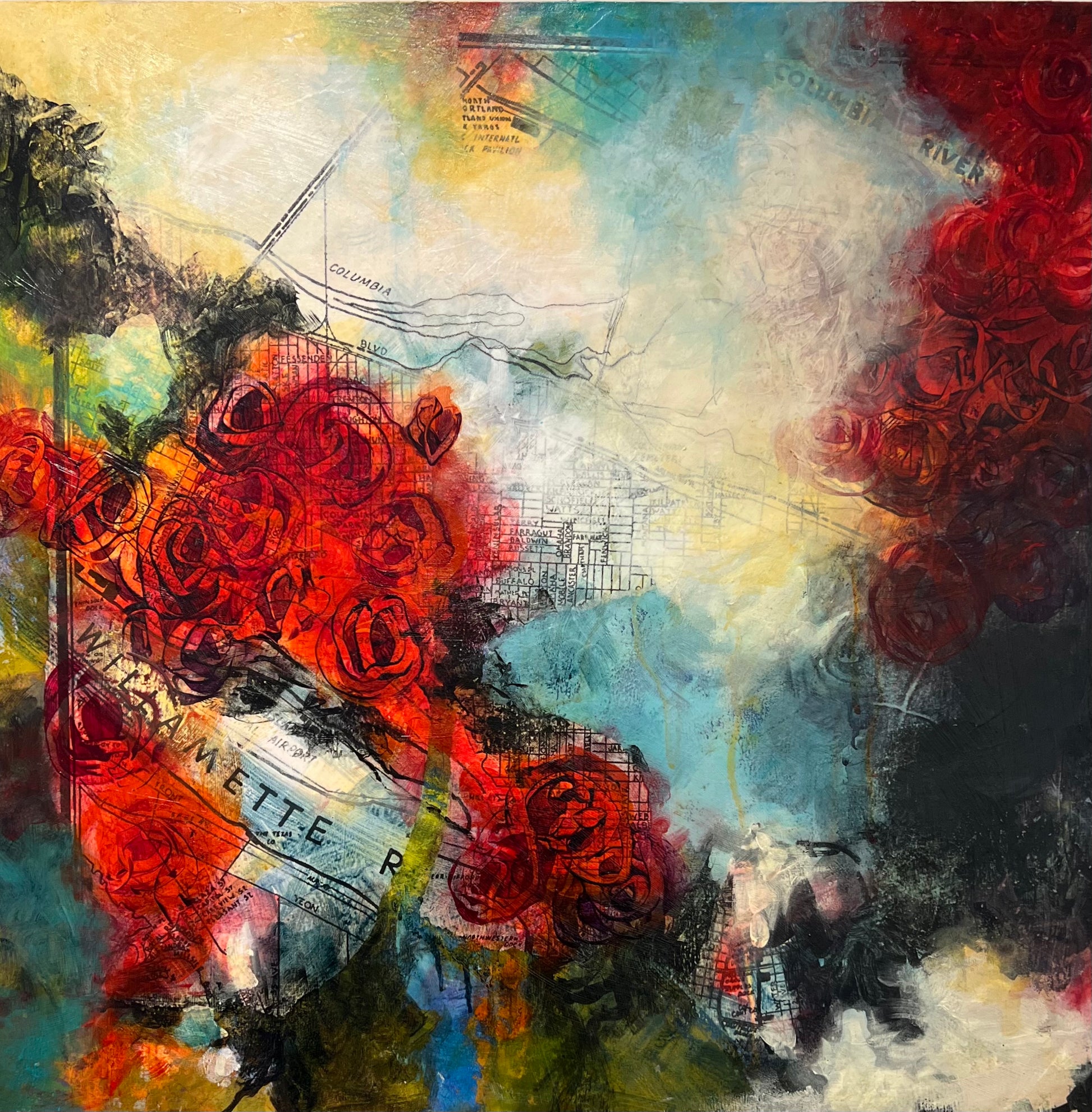 Mixed media, acrylic painting incorporating a vintage Portland mad and stylized roses.